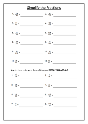Simplifying Fractions Worksheets - Math-Drills News and Updates April 22, 2020 by Math-Drills Several simplifying fractions worksheets were re-worked to include name and date fields and some helper text on the answer key. Each worksheet also includes one sample answer on the question page. Simplying fractions is a useful skill for students to learn as it makes working with fractions that much easier.